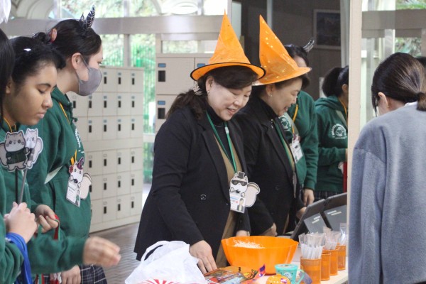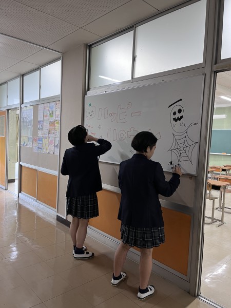 本校の高校生広報部隊「みどじょん」が今回より世代交代し、1年生の新メンバーにとってはプレデビューの会となりました。2年生が中心となり、校内を可愛らしく飾りつけしたり、当日は教員も「みどじょん」もハロウィングッズを身につけ、いつもと少し違った特別な雰囲気の中で参加者をお迎えしたりしました。