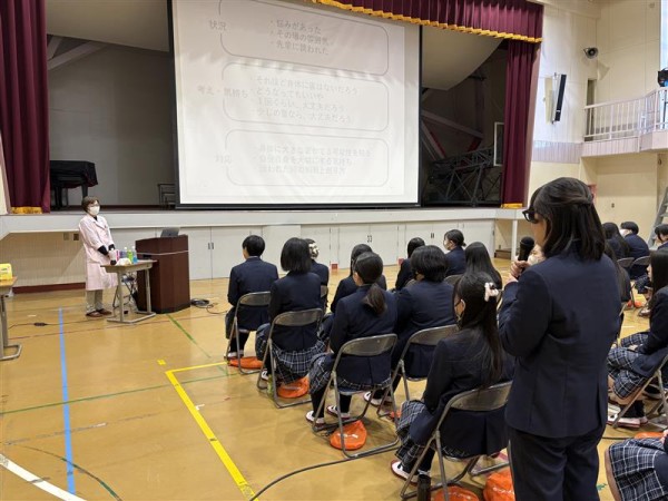 講演では、実際に、薬を用いた事例も実演していただき、薬の正しい服用方法や用量・用法を守ることの重要性が非常に分かりやすく伝えられました。また、「一度くらいなら大丈夫」「みんなが使っているから」という安易な気持ちが、取り返しのつかない結果を招く可能性があることについても強調され、生徒たちは真剣な表情で耳を傾けていました。