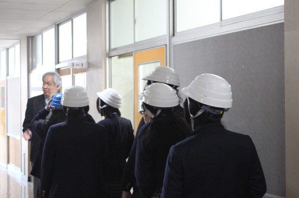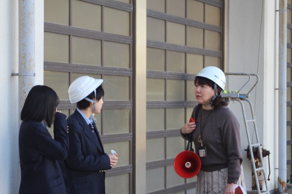 訓練開始の合図とともに、生徒たちは「グラッと揺れたらまずは机の下にもぐる」という基本動作を素早く実行し、自分の身を守る行動を徹底していました。また、揺れが収まった後の二次避難においても、ヘルメットを着用し、教員の指示に従って崩落個所を避けて安全に避難場所へ移動する姿が見られました。これらの行動が自然にできていることは、日頃の防災指導の積み重ねの成果であり、大変心強く感じました。